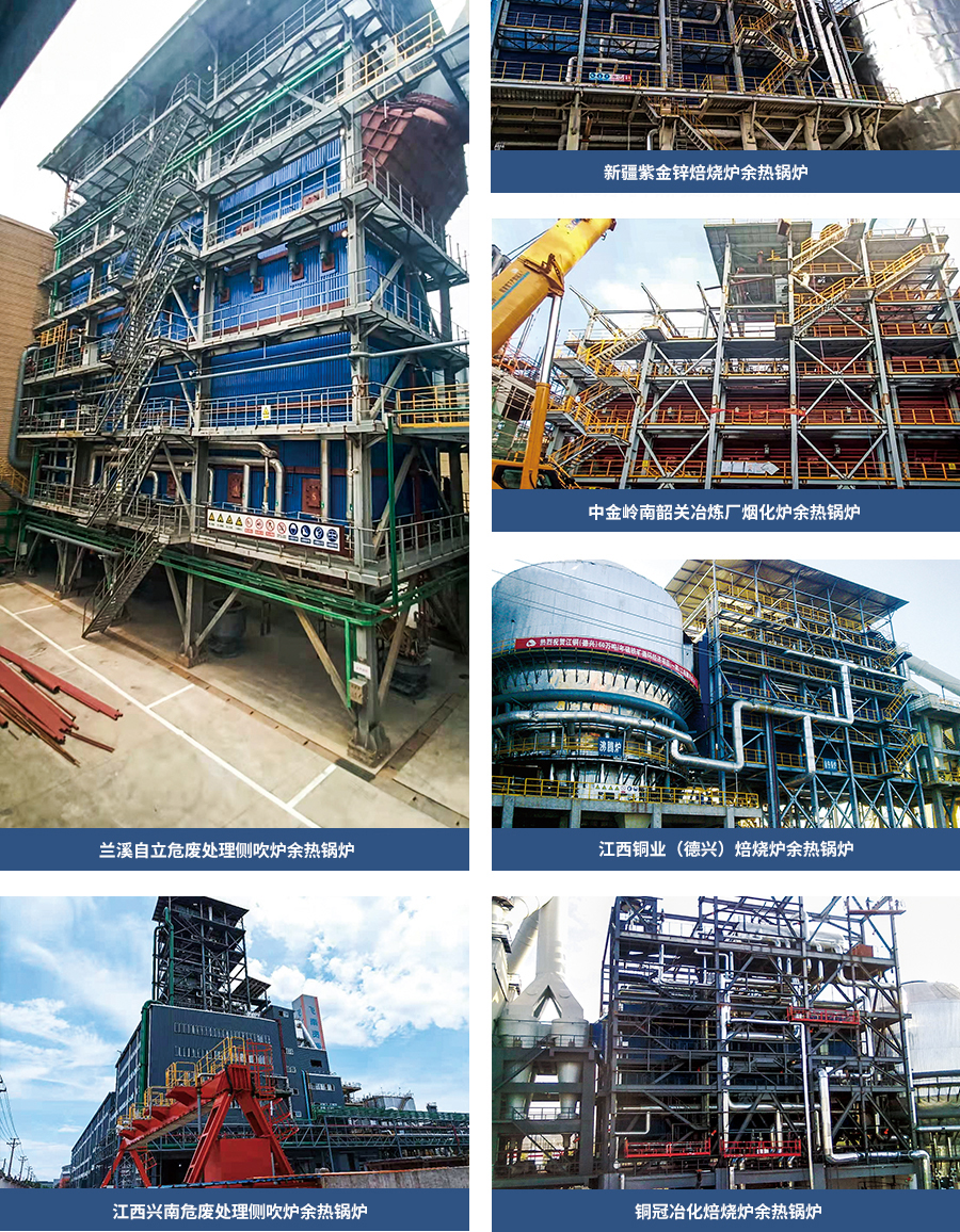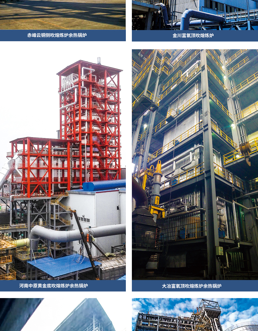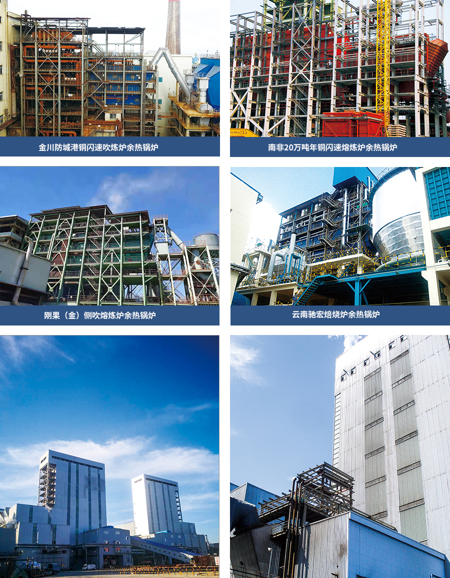 由我公司自主設計、制造、安裝的有色冶余熱鍋爐服務于國內外各大有色冶煉企業(yè),如金川集團、紫金礦業(yè)、江西銅業(yè)、中國銅業(yè)、云南錫業(yè)、馳宏鋅鍺等,有色市場占有率90%以上。我們的研發(fā)團隊經過多年潛心研究,形成的產品有: