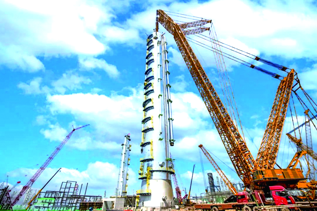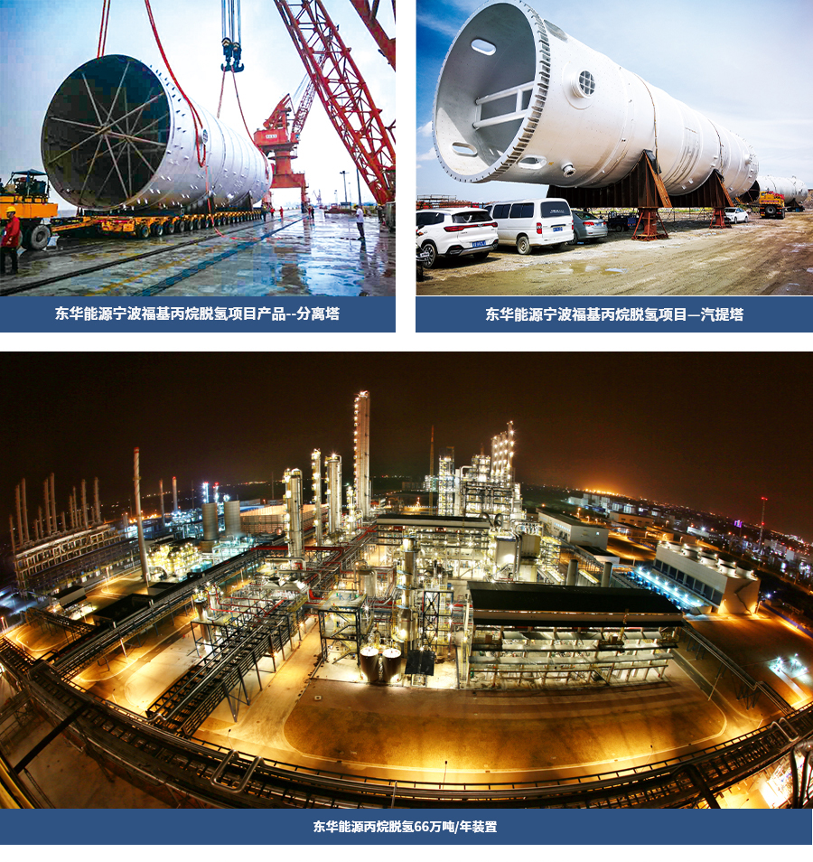 本公司為該項(xiàng)目提供了丙烷脫氫(PDH)裝置丙烯丙烷分離塔、脫丙烷塔、脫乙烷氣提塔等三臺(tái)大型設(shè)備,其中最大丙烯丙烷分離塔塔體直徑10米,長(zhǎng)度108米,重量1400噸。