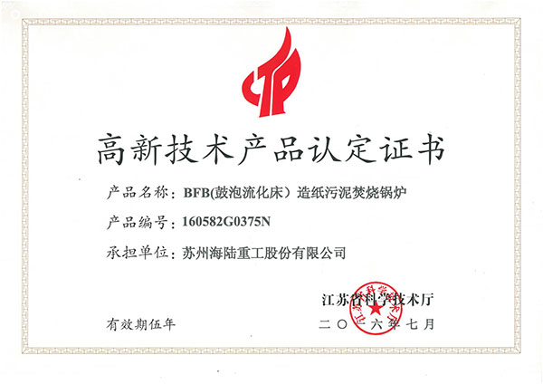 近日,公司收到江蘇省科學(xué)技術(shù)廳頒發(fā)的高新技術(shù)產(chǎn)品認(rèn)定證書, 我公司的研制BFB(鼓泡流化床)造紙污泥焚燒鍋爐獲省高新技術(shù)產(chǎn)品認(rèn)定。該產(chǎn)品主要用于造紙廠處理污泥工藝流程中,將造紙污泥干化后摻煤燃燒,解決污泥廢物處置問(wèn)題,同時(shí)對(duì)污泥焚燒過(guò)程產(chǎn)生的熱量進(jìn)行回收,產(chǎn)生次高壓蒸汽用于發(fā)電或造紙工藝循環(huán)利用,實(shí)現(xiàn)了環(huán)境污染治理與資源循環(huán)利用并舉。