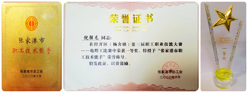 祝賀我公司倪強龍在經開區(qū)(楊舍鎮(zhèn))第三屆職工技能大賽 電焊工比賽中榮獲一等獎,并被 授予“經開區(qū)(楊舍鎮(zhèn))技能 明星”榮譽稱號!